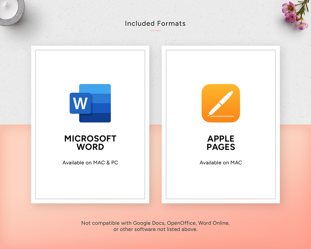 •  IMPORTANT: Not compatible with Google Docs, OpenOffice, Word Online, or other software not listed above. Contact me before purchasing if you'd like to use this template in other software.